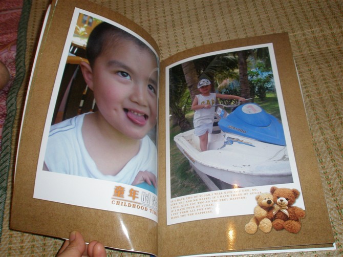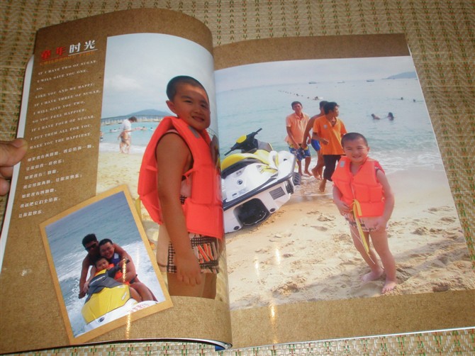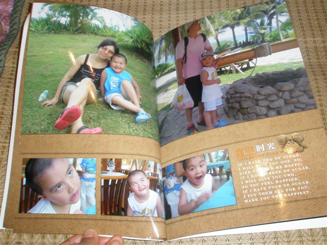 個性雜志的頁數不能增加,有點遺憾哦。眼看那幾百張的照片,只好選擇四十頁一本的那種精裝豎式照片書。加工的速度還是那么快,從下單到收到包裹花了四天左右時間吧。很佩服有福網的辦事效率:)照片書的外型很像一本硬皮抄,封面封底完全就是硬皮抄那樣,里面的紙張我同樣也選擇了過膠,12X8還是夠大了。原來擔心照片會比較小,看來沖印效果還是令我滿意的。不過,個人還是比較喜歡雜志的那種風格,翻著的時候,就感覺在翻明星雜志畫冊。可是,魚和熊掌不能兼得嘍。要內容多的,就只好舍棄漂亮的雜志了。接著上第一本照片書的圖片吧。