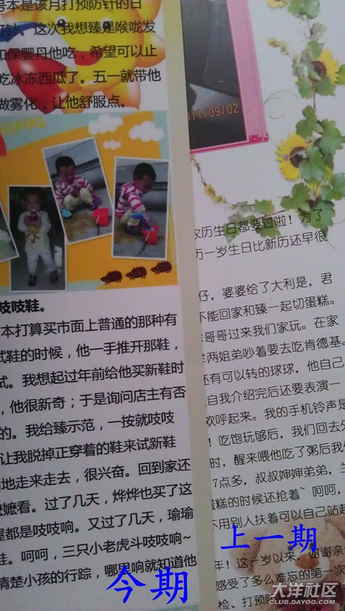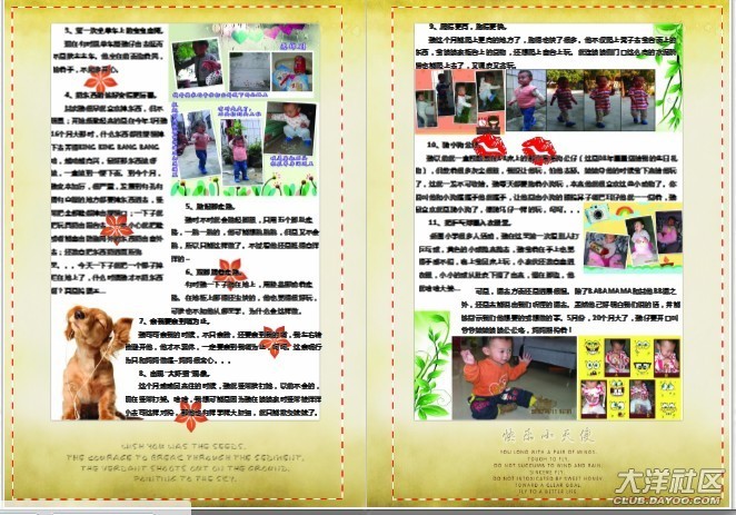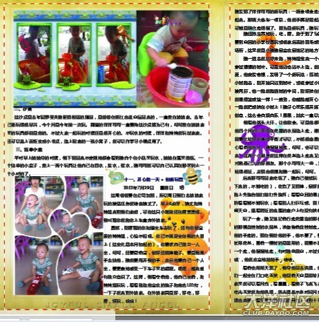 完成照片問題,沒弄明白菲媽說的加陰影和線條,讓相片立體一些,那算了,就不加了。當(dāng)我放日記內(nèi)容的時(shí)候,經(jīng)常遇到“文字區(qū)域顯示不完全”的問題。調(diào)整調(diào)整再調(diào)整。最后在第五頁的標(biāo)題欄,怎么也弄不到,因?yàn)樘崾?ldquo;文字區(qū)域顯示不完全”這一欄剛好擋住我的標(biāo)題,沒法移出來調(diào)整。我只是在原來的標(biāo)題上加了序號字“五”和改成藍(lán)色和黑體,只顯示不出“五、”,所以就算了沒有重新弄過這一頁。