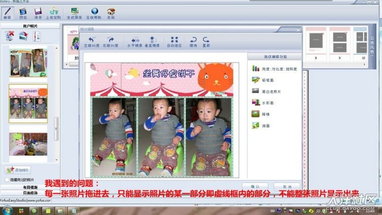 由于自己不會弄,本以為按照菲媽寫的步驟完全按照她的來做,但她怎么能一頁里面放那么多圖片,而我的只放一張進(jìn)去也顯示不了整張照片?當(dāng)時(shí)請教菲媽,一直沒發(fā)現(xiàn)她給我的消息留了她Q號說在QQ里詳細(xì)聊才說得清楚(最近幾天才在看到這消息),而我又沒多少時(shí)間上網(wǎng),所以真不好意思呀菲媽。而她說的在文字框里插入,我也沒弄明白是怎么插入。跟有福網(wǎng)客服磨了半天,客服說來說去都說是我的照片問題,而且她們的回答也不是即時(shí)的,要等,所以我也不跟她們耗時(shí)間了,靠自己吧。