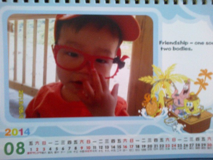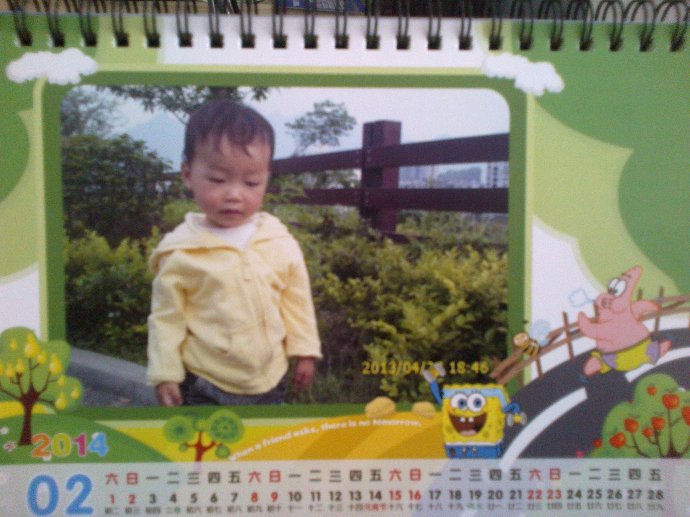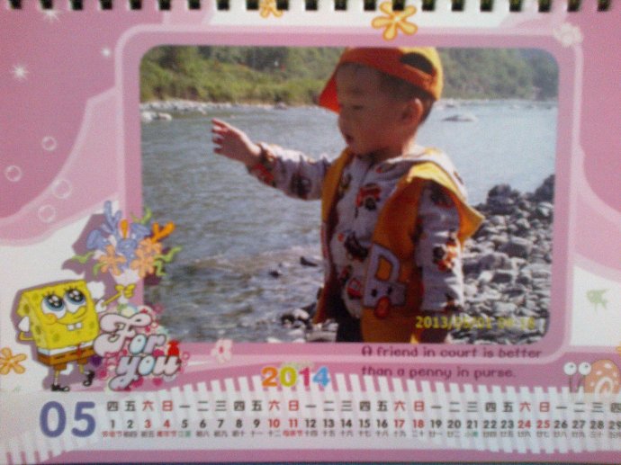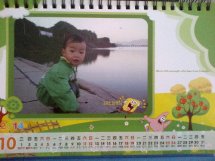 我制作這本臺歷時,在選模版的問題上糾結了好半天拿不定主意,因為都太好看了,于是我將自己最終選好的兩個模版都制作了一遍。將先前挑選好的照片上傳、簡單的修飾、保存在我的作品欄里。決定等兒子午睡醒后,讓他自己來選一個,他毫不猶豫地選了《海綿寶寶》這個模版,理由是:和我書包上海綿寶寶一模一樣,我好喜歡海綿寶寶呀!