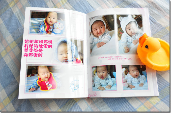 買了單反相機后,就不想在影樓做相冊了,領著孩子去照相也很費時間,孩子還經常不配合,而且好的影樓價格太貴。還不如用自己給孩子照的生活照做相冊,更自然些。于是就在網上漫無目的的搜尋制作相冊的網站,無意中進了有福網。正巧網站搞活動,新注冊用戶制作12*8的照片書打6折,才47元。不錯,適合我的心里價位。于是趕緊下載他家的軟件制作了一份苗苗1-3個月的冊子。