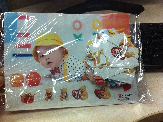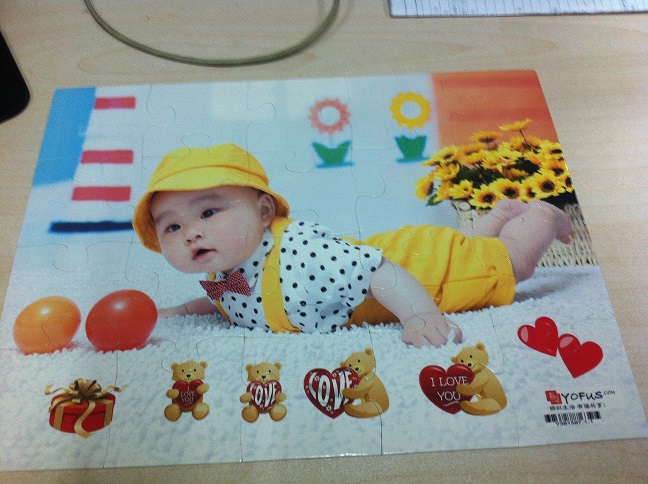 后來在有福網用兒子的照片定制啦一套個性拼圖,當他看到的時候樂呵呵的.當天晚上兒子把兩個拼圖都玩會了,讓我沒想到得是,第二天早晨,一起床,就自己跑去玩拼圖了,而且這次很順利,速度也很快。