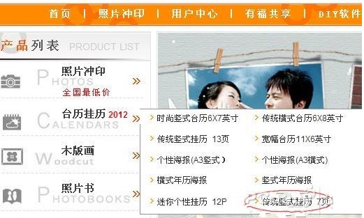 3、因為我們這次所要做的是掛歷,所以我們可以到左側豎欄找到“臺歷掛歷”,至于這個2012,我想是每年都變得吧,相信明年一定是變成2013了,呵呵。這次咱們體驗的是7頁的傳統豎式掛歷,大家可別選錯喲!