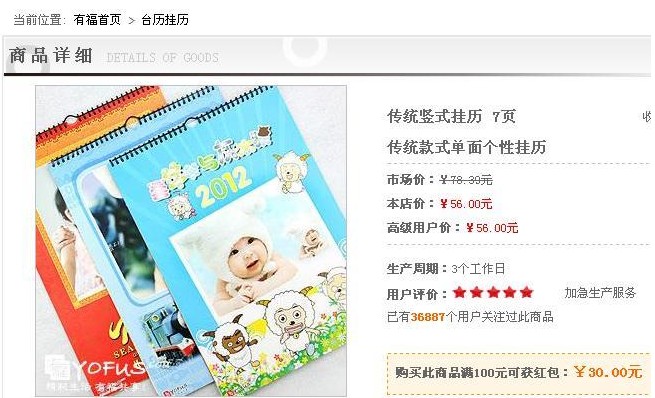 4、選對掛歷點進去,我們就可以來瀏覽這款掛歷的詳細信息了。呵呵,我們可以看到,這款產品正在促銷呢。只要買滿100元就可以獲得30元紅包喲!