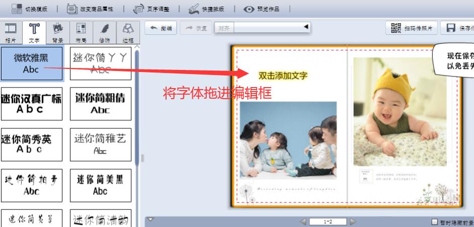 點擊“文字”按鈕將字體拖進編輯頁面后雙擊輸入文字,再點擊添加文字文本框可以編輯字體、字號、顏色、對齊方式等