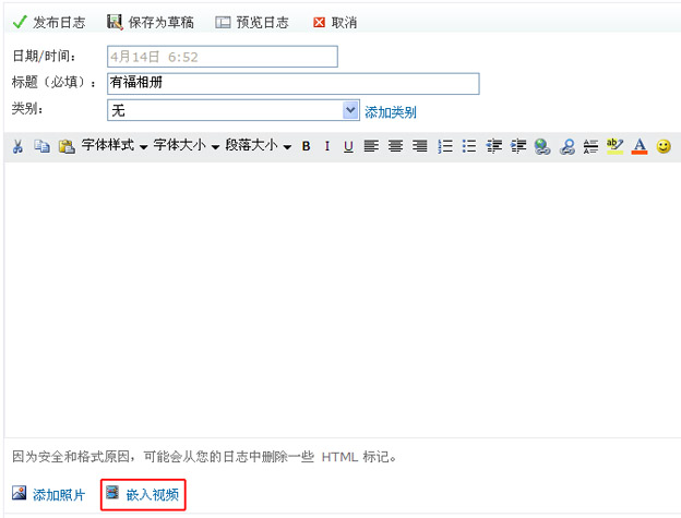 3、進入MSN空間寫日志,選擇嵌入視頻;